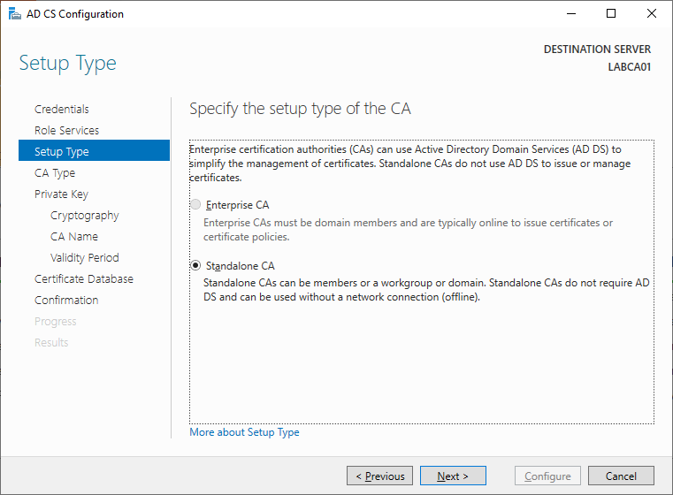 Standalone CA vs Enterprise CA: A Standalone CA is basically a CA running on a non-domain joined server. Our Root CA (LABCA01) will not be joined to the domain and hence is an example of a Standalone CA. Enterprise CA’s on the other hand are just the opposite, they are domain joined and integrated with Active Directory Domain Services.