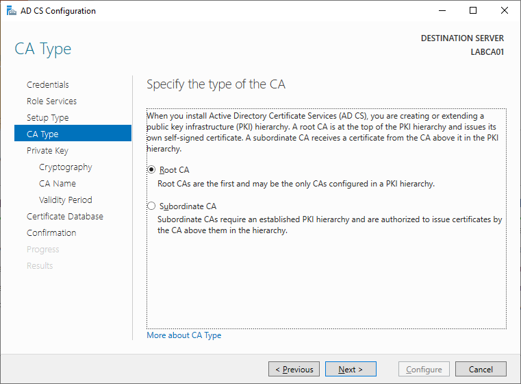 Root Certification Authority: Certificates are based on a trust chains, the first Certification Authority that is installed will be the Root CA since its the first element in our trust-chain.